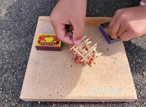 ねーねーばぁば マッチを組み立てて火をつけたらどうなるの? やってみたらええやん 耐火レンガの上にマッチを組み立てる なんか雑やな〜組み立てがっ 早く火ぃつけたい気持ちが溢れてるわ ばぁばの一言に え〜(バレた?)のモグラの顔 マッチをすって2回 …