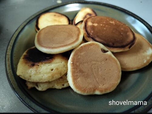 時間ある休みの日はいいのぉ キッチンにモグラ ホットケーキミックス、卵、豆乳を混ぜ混ぜ フライパンに直径3〜5cmの生地を並べ コンロの前に座ってひっくり返すタイミングを見る モグラはこのおやつ作りの時間が好きみたい 火加減が上手くいかなかったと2回…